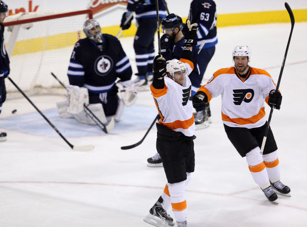 Philadelphia Flyers’ Jakub Voracek (93) and Nicklas Grossmann (8) celebrate after Voracek scored quickly in overtime to defeat the Winnipeg Jets’ during NHL hockey action in Winnipeg, Sunday, December 21, 2014. THE CANADIAN PRESS/Trevor Hagan